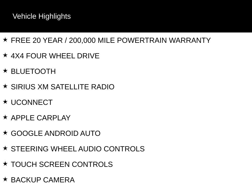 FREE 20 YEAR / 200,000 MILE POWERTRAIN WARRANTY, 4X4 FOUR WHEEL DRIVE, BLUETOOTH, SIRIUS XM SATELLITE RADIO, UCONNECT, APPLE CARPLAY, GOOGLE ANDROID AUTO, STEERING WHEEL AUDIO CONTROLS, TOUCH SCREEN CONTROLS, BACKUP CAMERA, KEYLESS PUSH BUTTON START, AUTOMATIC HEADLIGHTS, POWER DRIVER SEAT, TOW PACKAGE / TRAILER PACKAGE, INTEGRATED TRAILER BRAKE CONTROLLER, RUNNING BOARDS, BIG HORN SERIES, LEVEL 1 EQUIPMENT GROUP, QUICK ORDER PACKAGE 2GZ BIG HORN, 3.73 AXLE RATIO, 6 SPEAKERS, 8.4" TOUCHSCREEN DISPLAY, AIR CONDITIONING, AUTO POWER-FOLDING MIRRORS, BRAKE ASSIST, COMPASS, DELAY-OFF HEADLIGHTS, DUAL GLOVE BOXES, ELECTRONIC STABILITY CONTROL, EMERGENCY COMMUNICATION SYSTEM: SIRIUSXM GUARDIAN, EXTERIOR MIRRORS W/HEATING ELEMENT, EXTERIOR MIRRORS W/SUPPLEMENTAL SIGNALS, FORWARD & REVERSE UTILITY LIGHTS, FRONT ARMREST W/CUPHOLDERS, FRONT FOG LAMPS, HEATED DOOR MIRRORS, LEATHER WRAPPED STEERING WHEEL, LOCKING LOWER GLOVE BOX, LOW TIRE PRESSURE WARNING, OCCUPANT SENSING AIRBAG, OUTSIDE TEMPERATURE DISPLAY, OVERHEAD AIRBAG, OVERHEAD CONSOLE, PANIC ALARM, PARKVIEW REAR BACK-UP CAMERA, PASSENGER DOOR BIN, PASSENGER VANITY MIRROR, POWER ADJUST MIRRORS, POWER DOOR MIRRORS, POWER TELESCOPING MIRRORS, POWER WINDOWS, REAR 60/40 FOLDING SEAT, REAR FOLDING SEAT, REAR STEP BUMPER, REMOTE KEYLESS ENTRY, SELECTABLE TIRE FILL ALERT, TILT STEERING WHEEL, VARIABLY INTERMITTENT WIPERS, WHEELS: 18" X 8.0" STEEL CHROME CLAD.